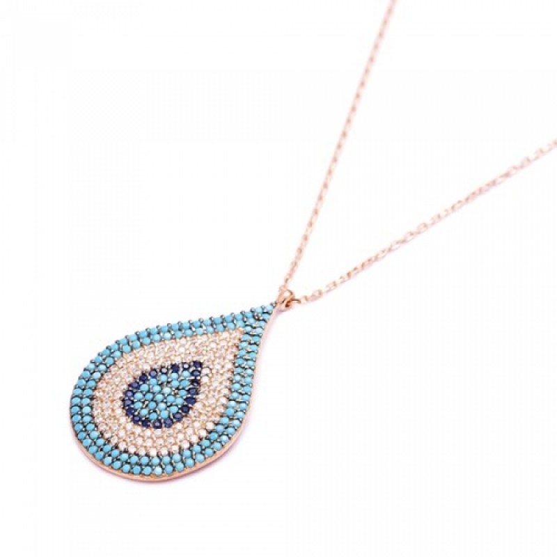 Keep misfortune away by this teardrop design evil eye pendant necklace. Crafted in mix zircon, Turquoise, blue zircon and clear zircon, a beautiful combination. A meaningful present for the one you want to protect. Jewelry Sizes 32x21 mm Jewelry Weight 6.65 gr..